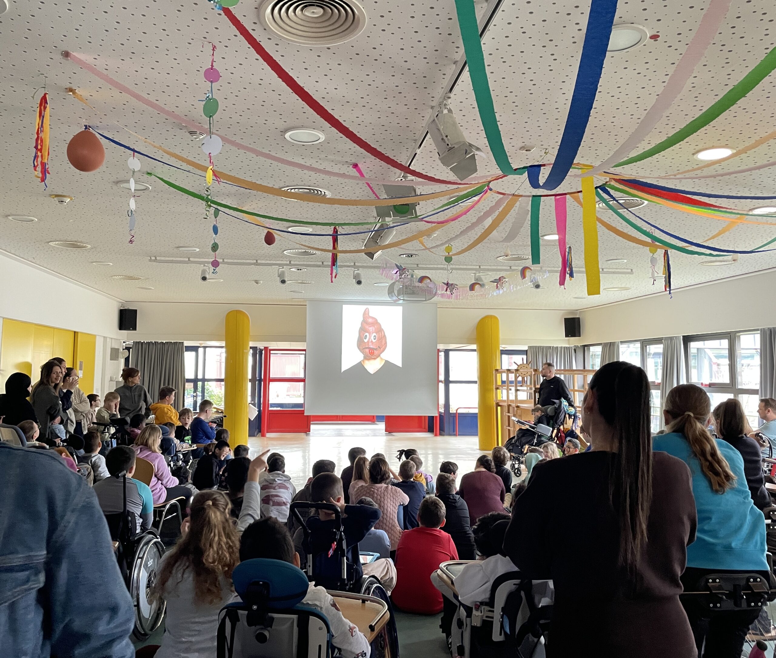 Wir haben uns einen vom Schülerrat gedrehten Film angeschaut, in dem Schülerinnen und Schüler oder Mitarbeitende der Schule erzählt haben, was sie richtig kacke finden. Alle durften heute die Wörter „Kacke“ oder „Scheiße“ benutzen und das fanden die meisten SuS mal richtig toll. Außerdem gab es einen großen Kackhaufen aus Pappmaché, der viele SuS beeindruckt hat.