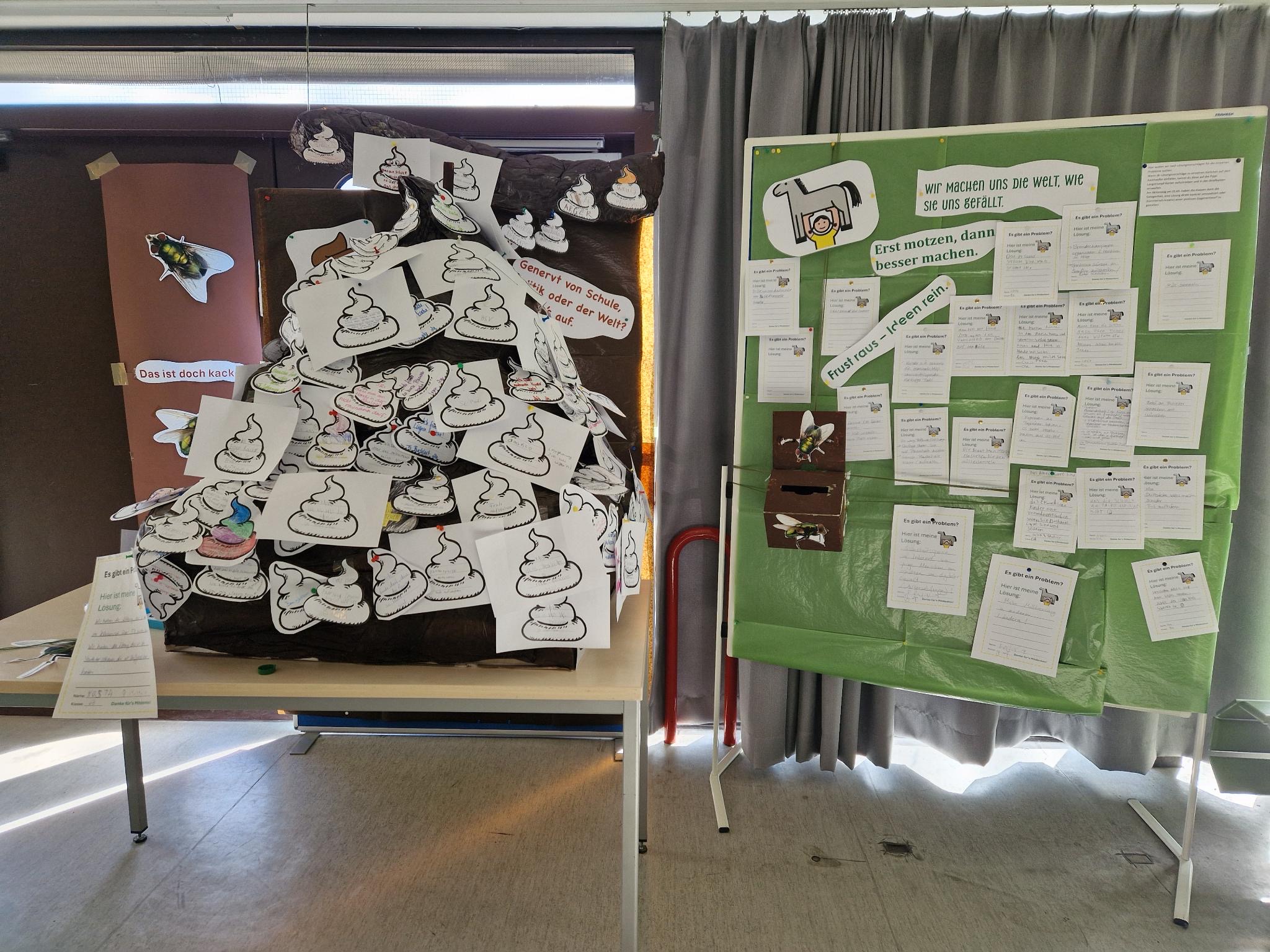 Ganz nach dem Motto von Pippi Langstrumpf haben sich gestern und auch schon in den vergangenen Tagen die Klassen mit verschiedenen Problemen beschäftigt. Jede Klasse hat sich von dem großen Kackhaufen von der Auftaktveranstaltung ein Problem ausgesucht und zu diesem dann Lösungsvorschläge überlegt. Einen Lösungsvorschlag hat sie dann ausgesucht und sich intensiver damit beschäftigt.